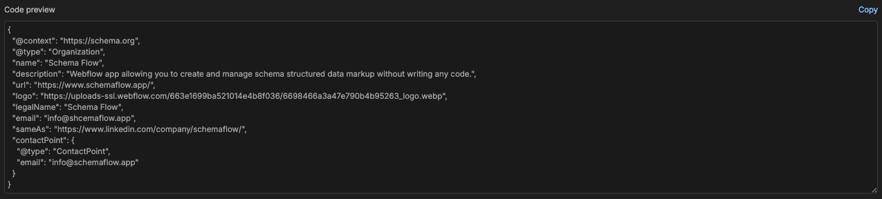 - Use the Code preview panel to confirm the generated JSON-LD looks correct.